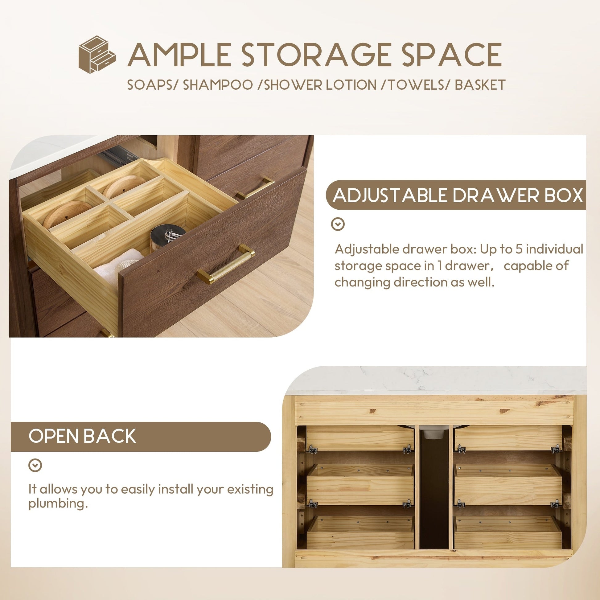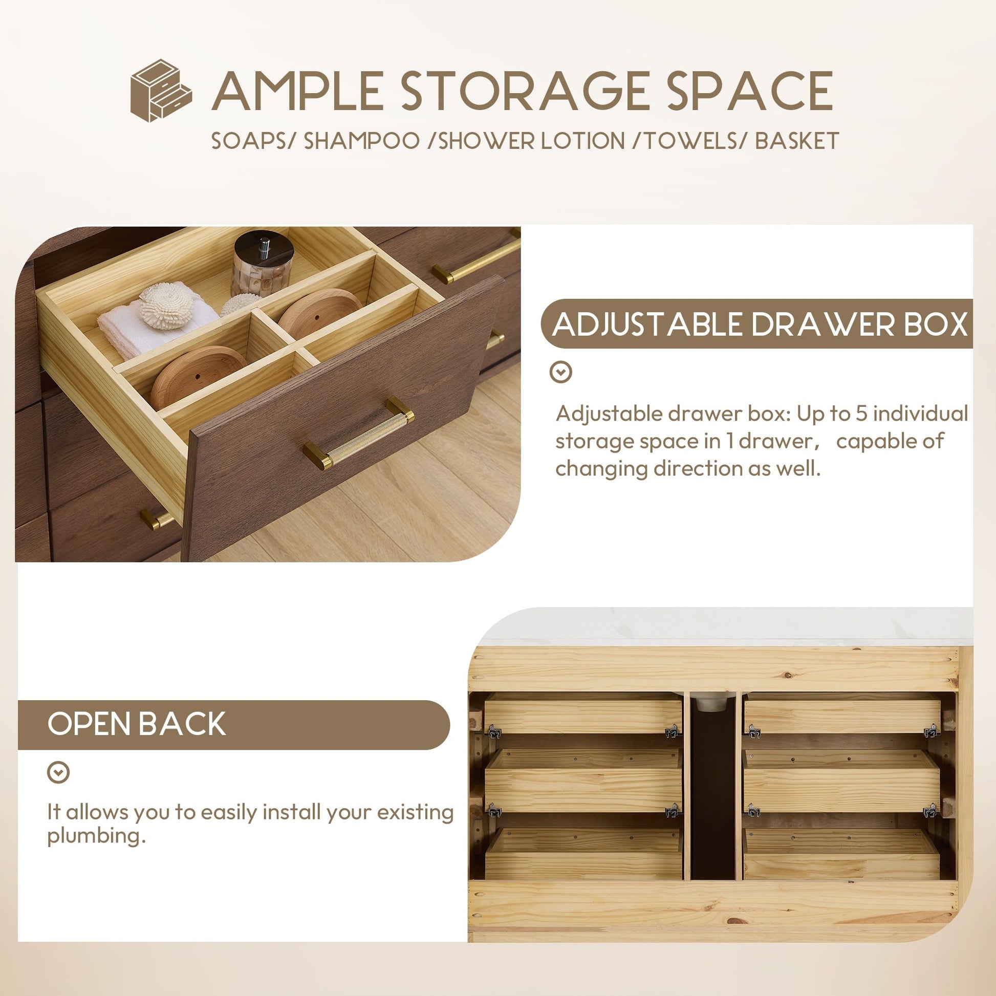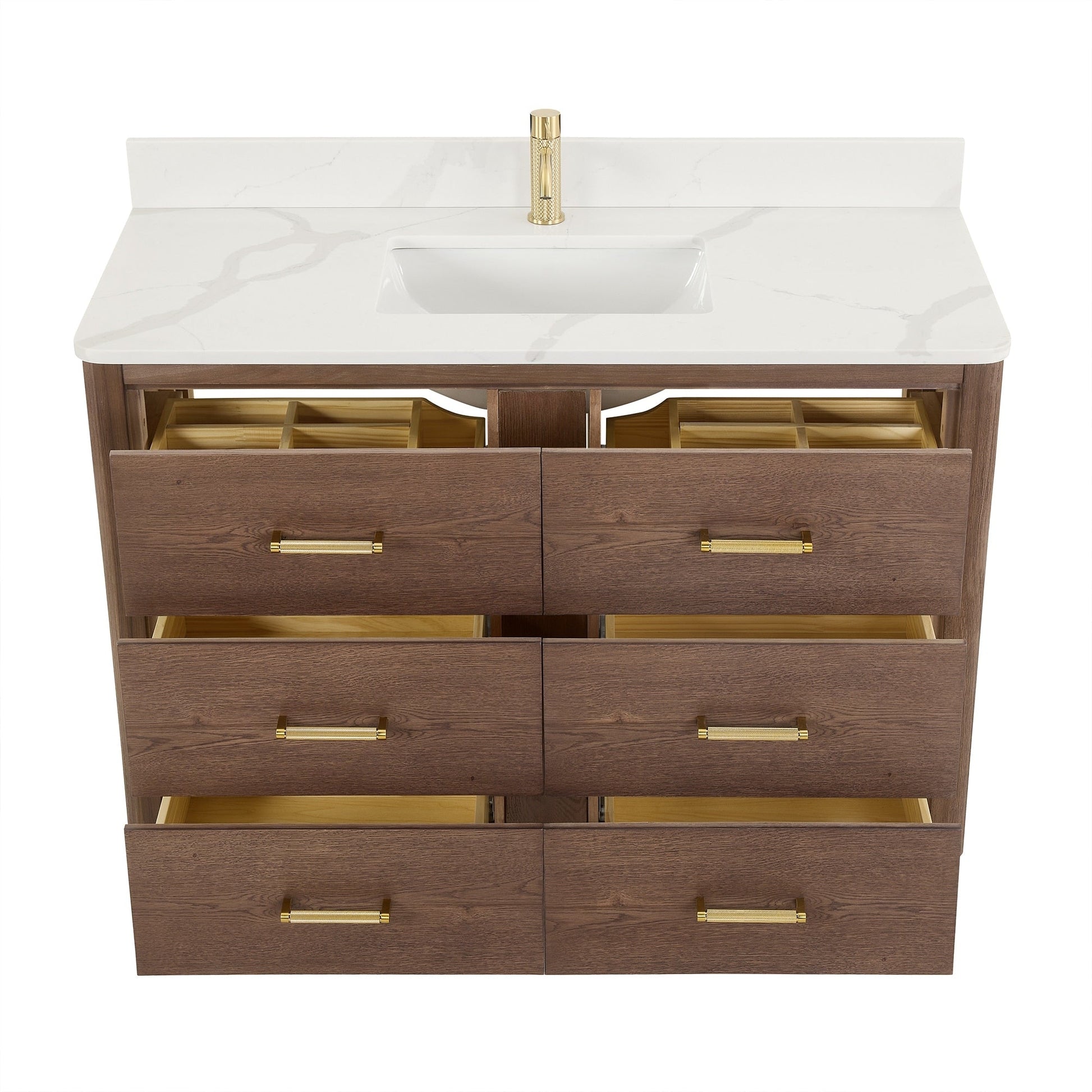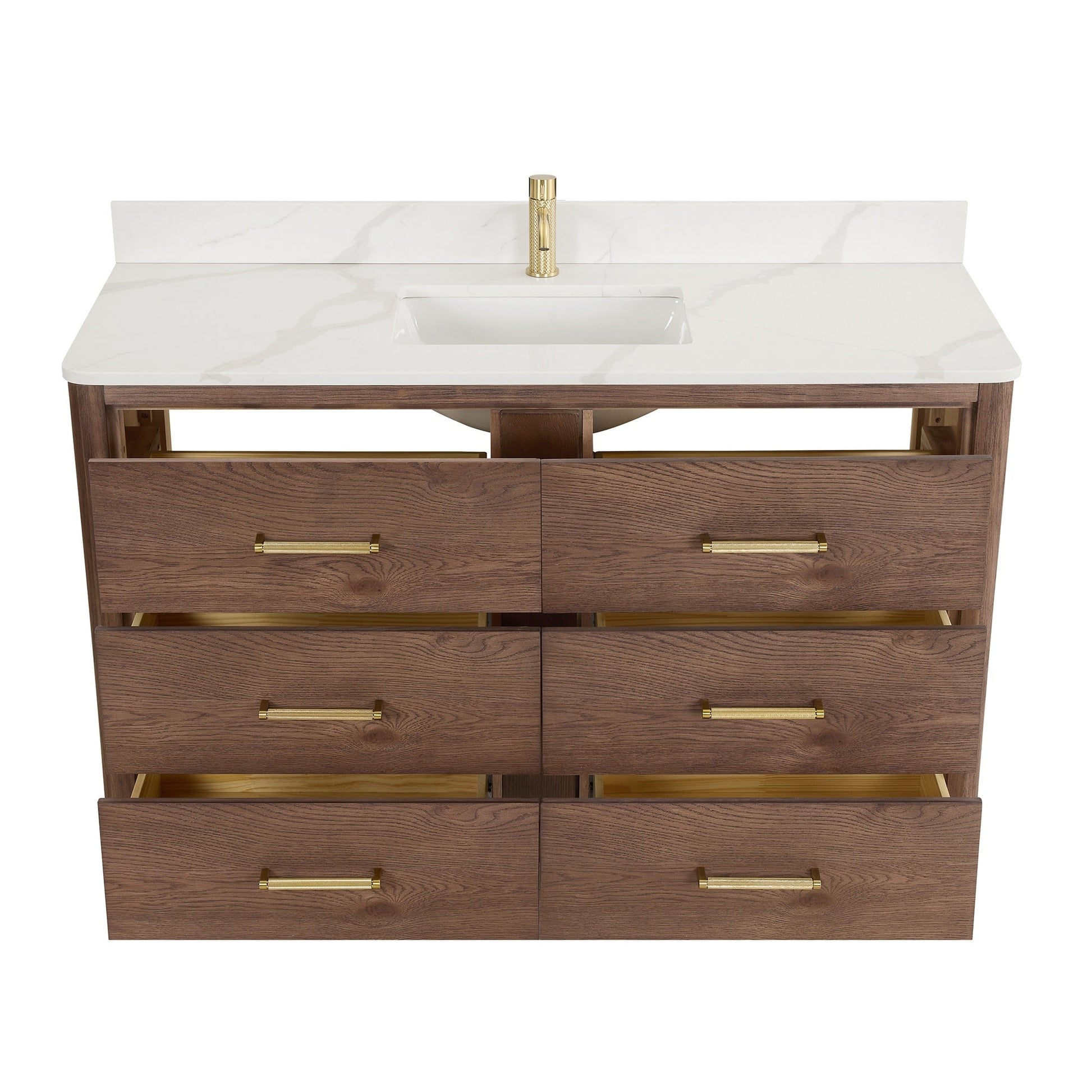 48 Inch - Six sturdy, soft-closing dovetail drawers feature built-in partitions for easy access to all your toiletries.
