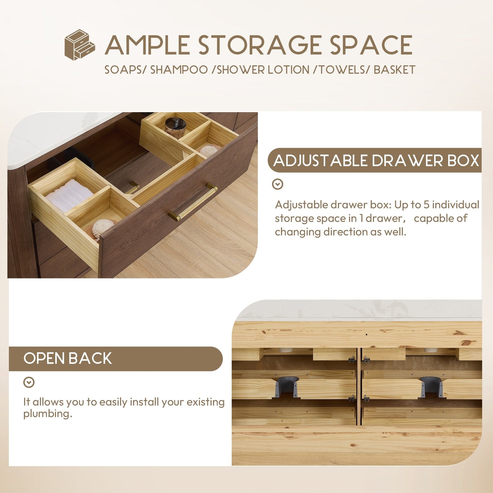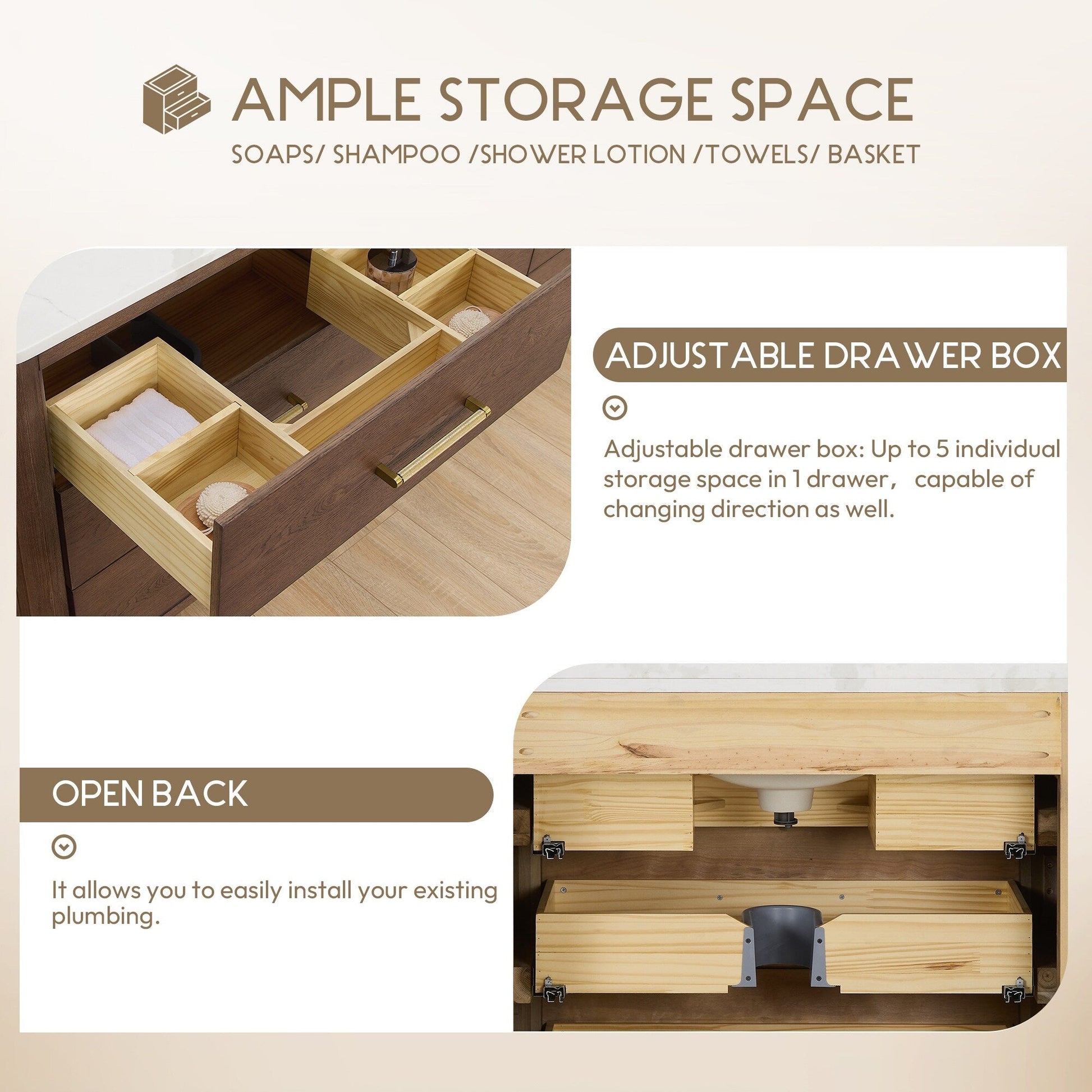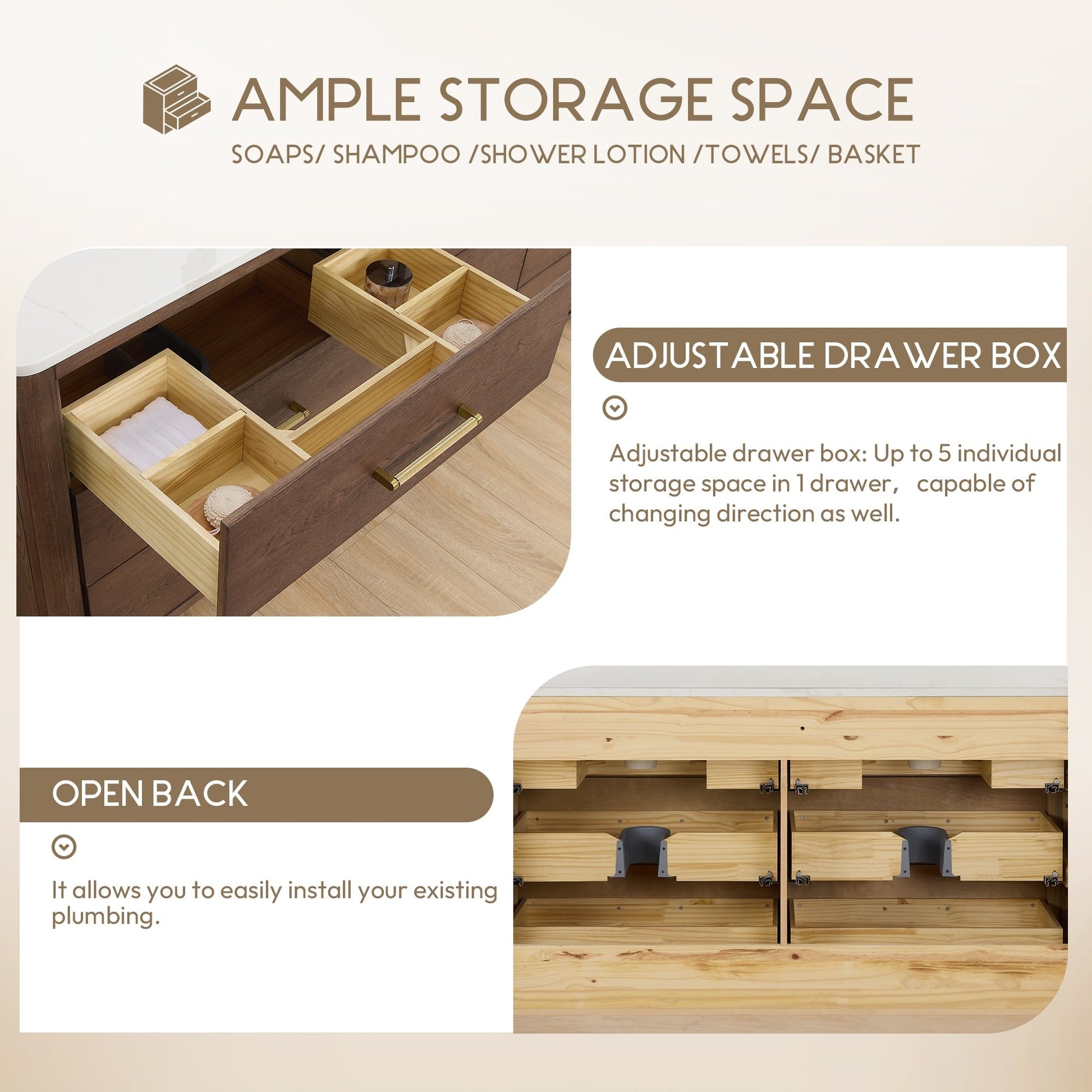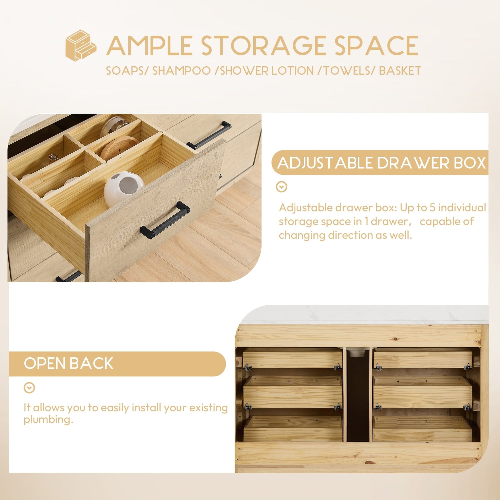 48 Inch - Six sturdy, soft-closing dovetail drawers feature built-in partitions for easy access to all your toiletries.