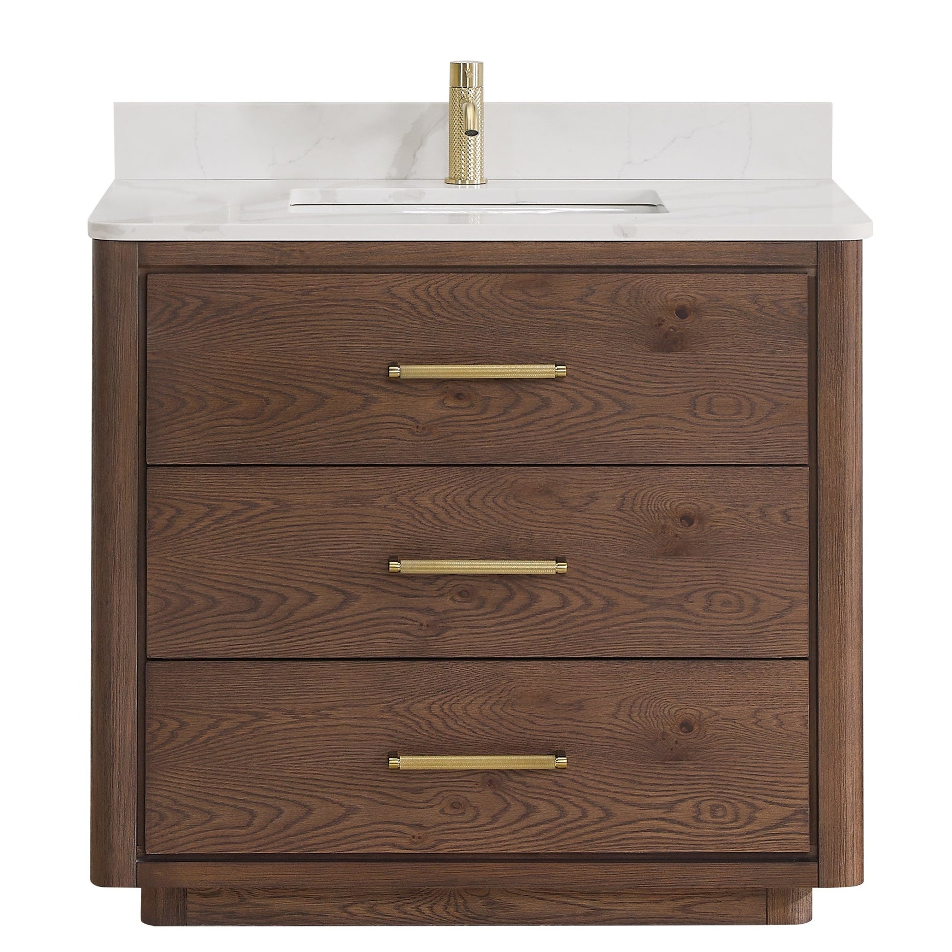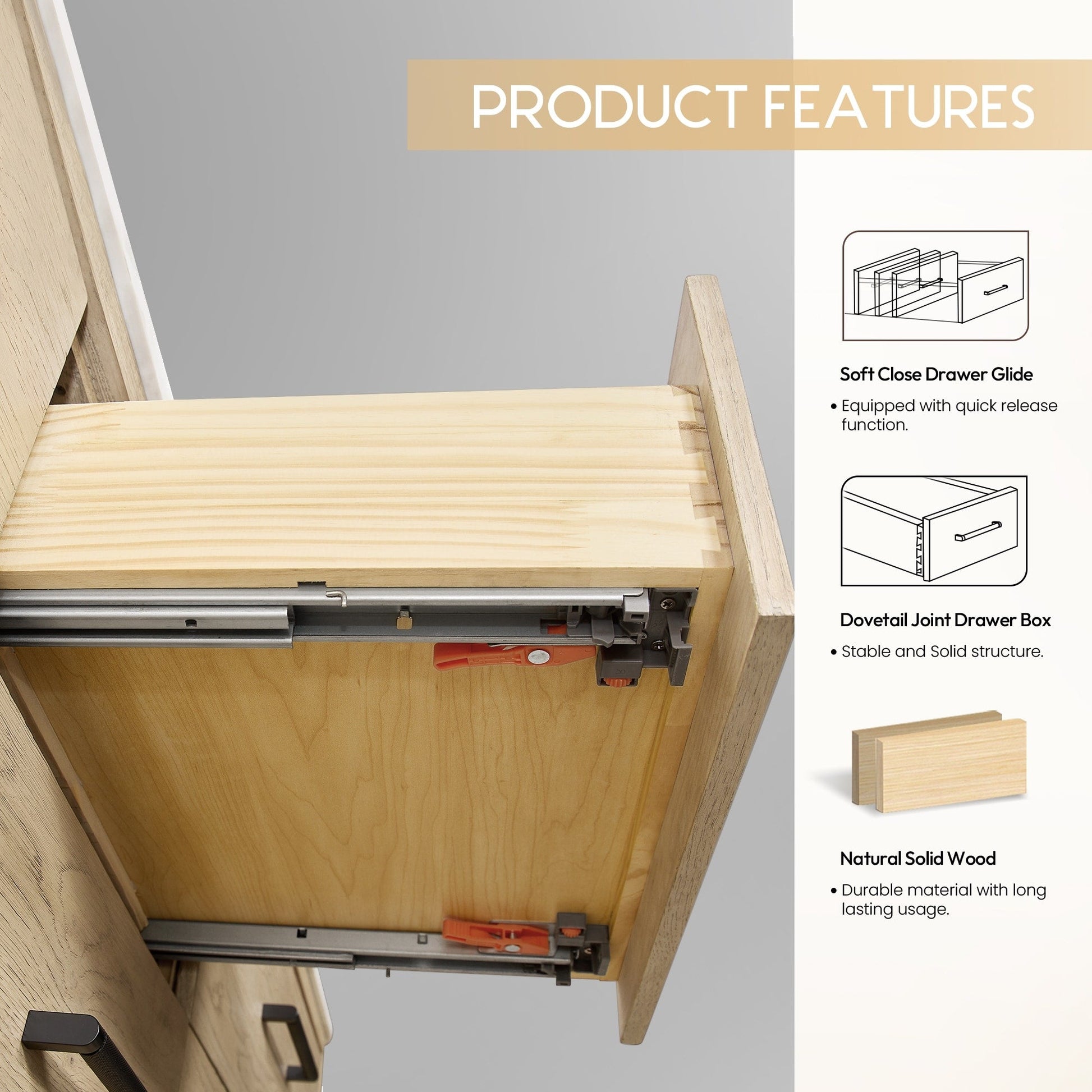36 Inch - Three sturdy, soft-closing dovetail drawers feature built-in partitions for easy access to all your toiletries.