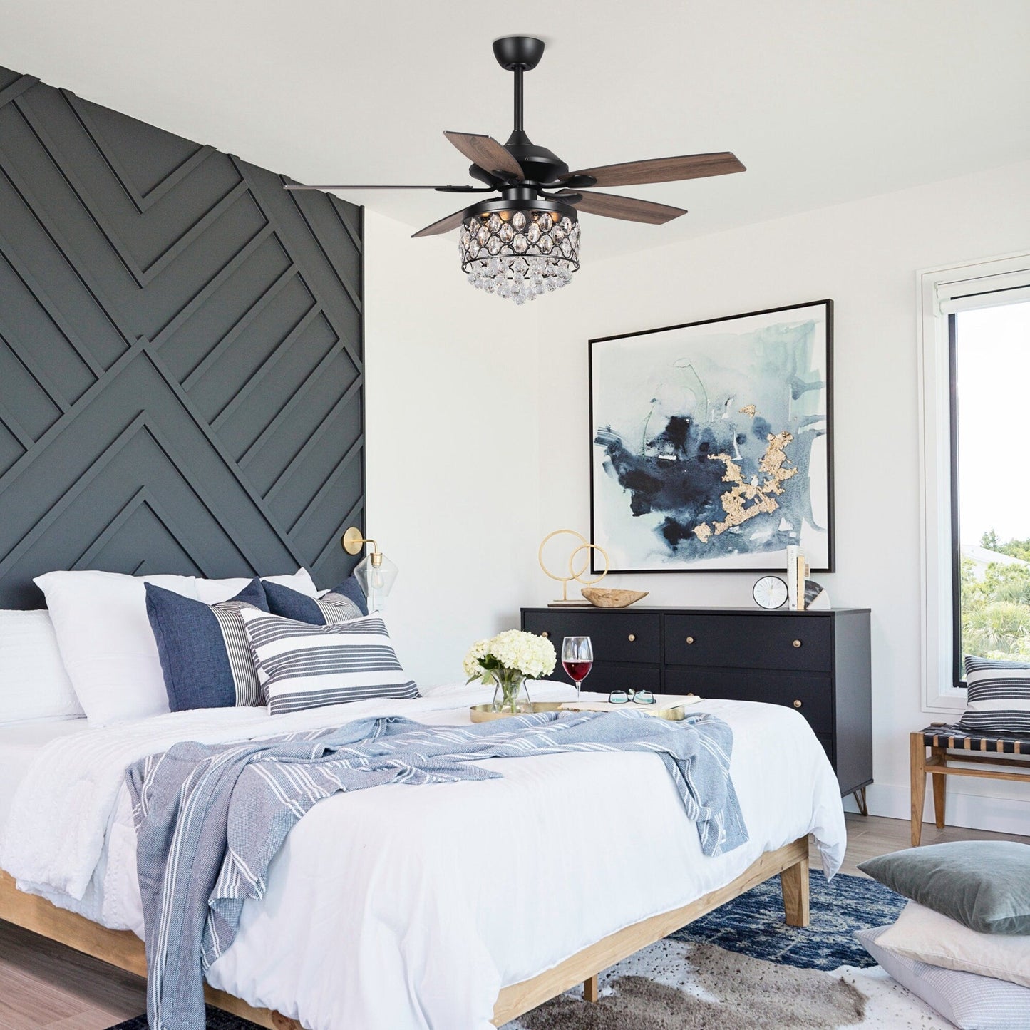 Enhance your home's elegance and comfort with this stunning Chrome/Crystal 4-light Chandelier Ceiling Fan. With its shimmering crystal embellishments, this 52-inch fandelier features a modern design that adds a touch of sophistication to any space. The remote-controlled, 3-speed reversible motor provides year-round comfort, and the fan's reversible switch helps to reduce energy costs.