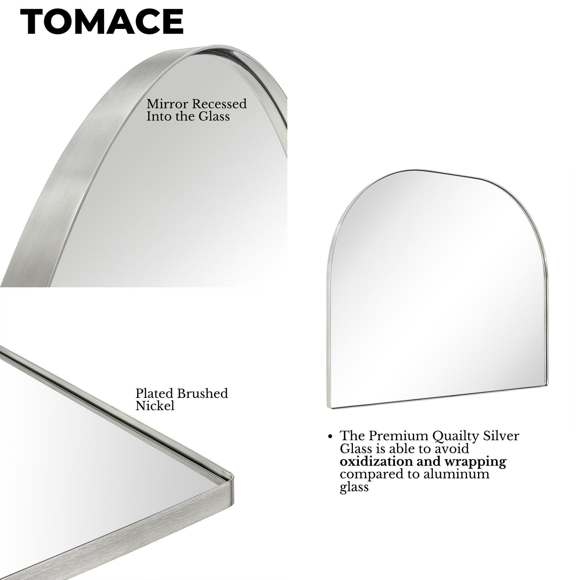 • Seamless Stainless Steel Frame: This arched  bathroom mirror uses preminum quality stainless steel material and 9mm  TSCA certified MDF backing to avoid both rust and corrosion when wall  mounted, making it safe for bathroom use as well.