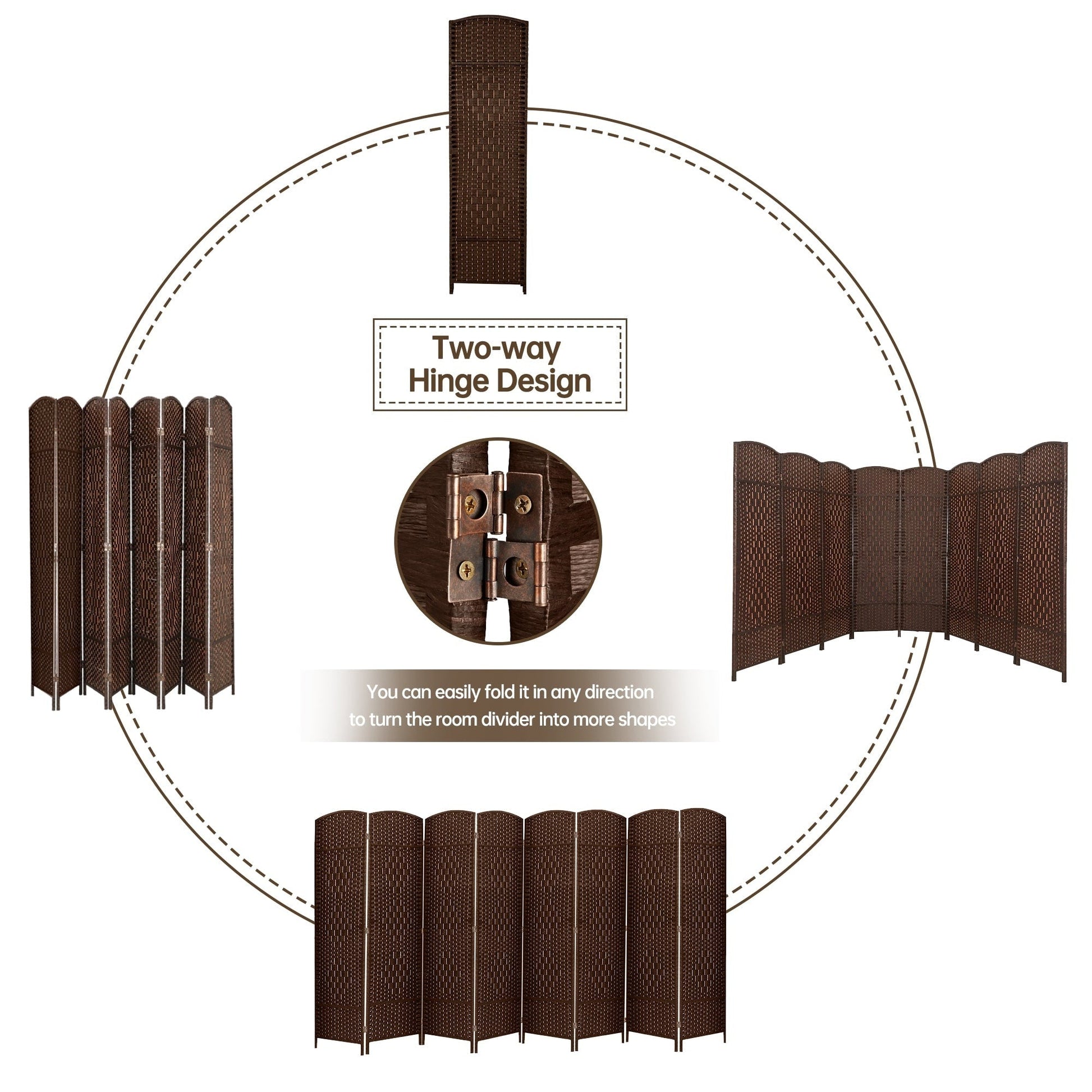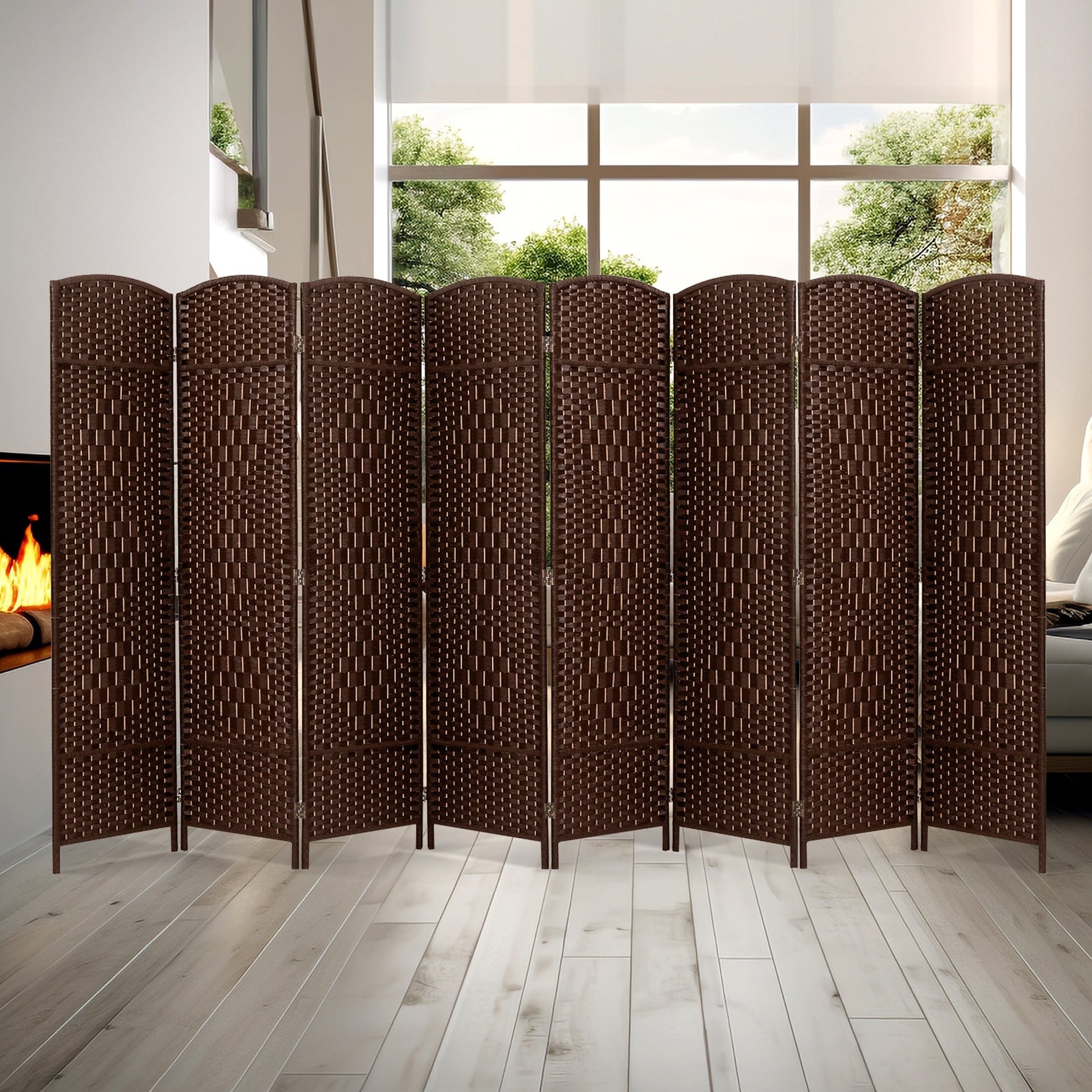 Discover versatile privacy and decor enhancement with our freestanding room divider. It functions as a sunscreen, room partition, and decorative cover, perfect for indoors and outdoors. Featuring 360° directional two-way hinges, the room divider folds flexibly for easy setup and storage. Ready to use upon arrival with upgraded packaging, it's crafted from lightweight, high-density woven fiber for durability. The privacy screens are available in brown, grey, and off white, choose from sizes accommodating 6 or 8 panels to fit your space seamlessly. Ideal for creating private spaces or adding aesthetic appeal to any environment effortlessly.