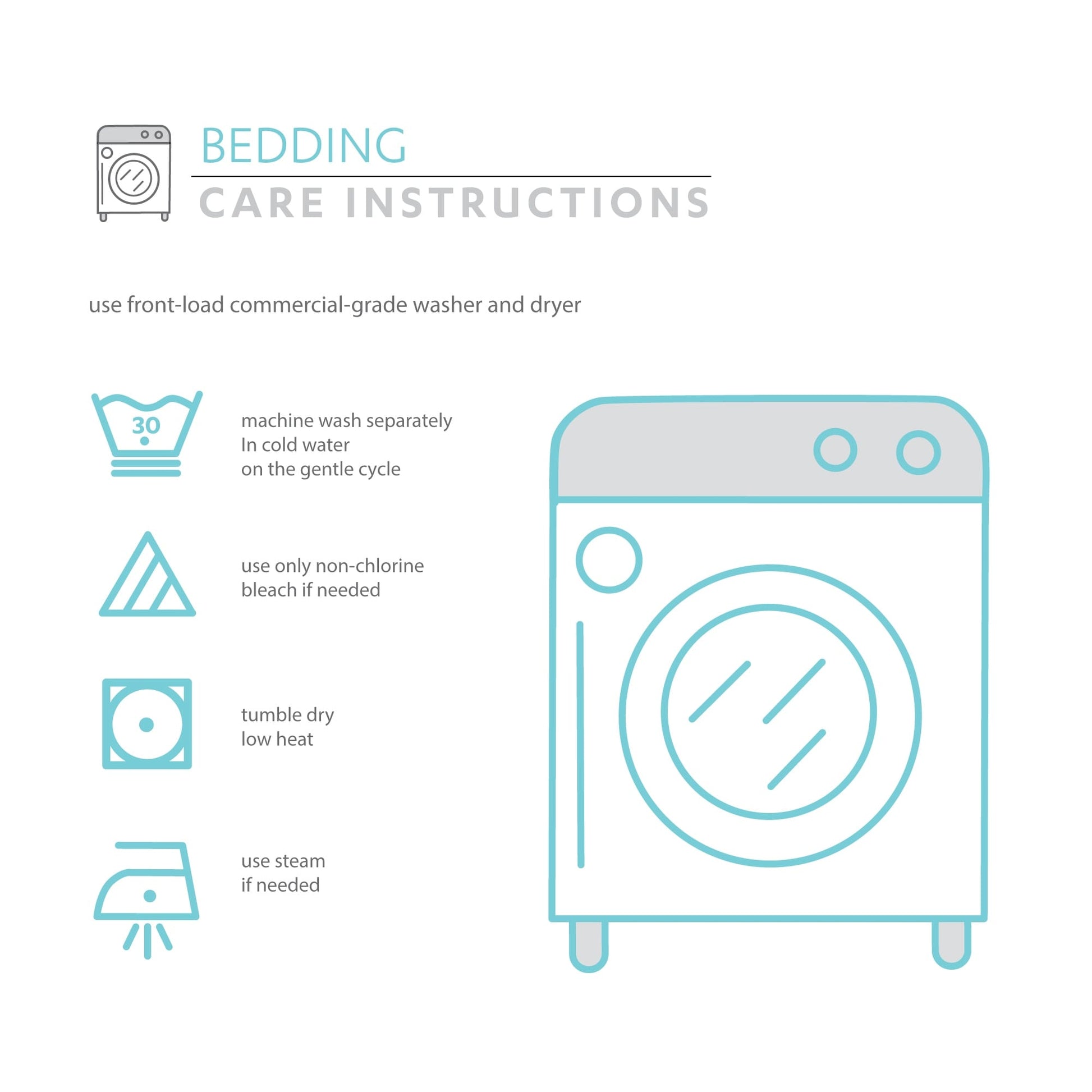 Use Front-Load Commercial Grade Washer And Dryer. Machine Wash Separately in Cold Water on the Gentle Cycle. Use Only Non-Chlorine Bleach If Needed.