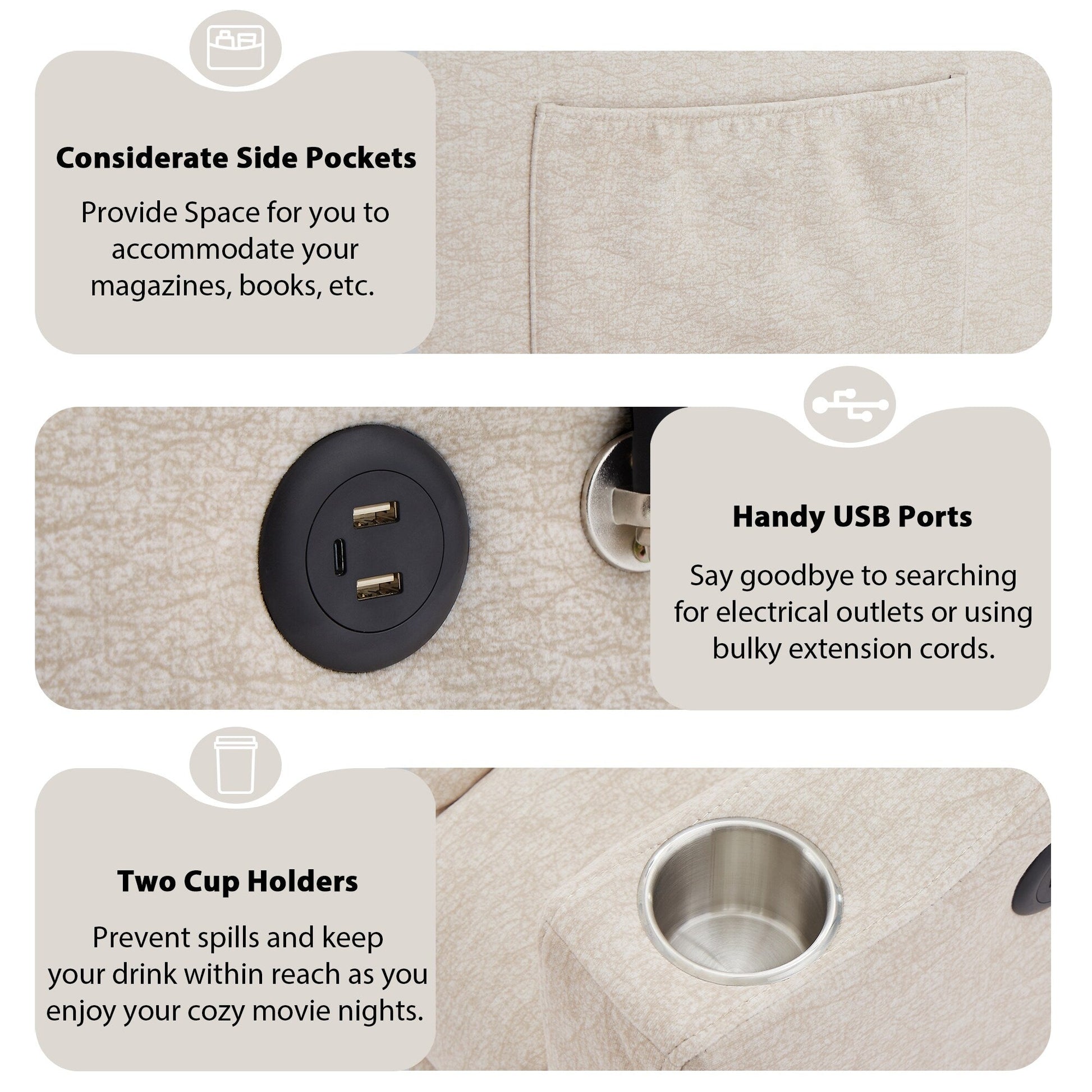 • Convenient Features: Includes 3 USB ports for easy charging, 2 side pockets for storage, and 2 built-in cup holders to keep drinks within reach without spills.