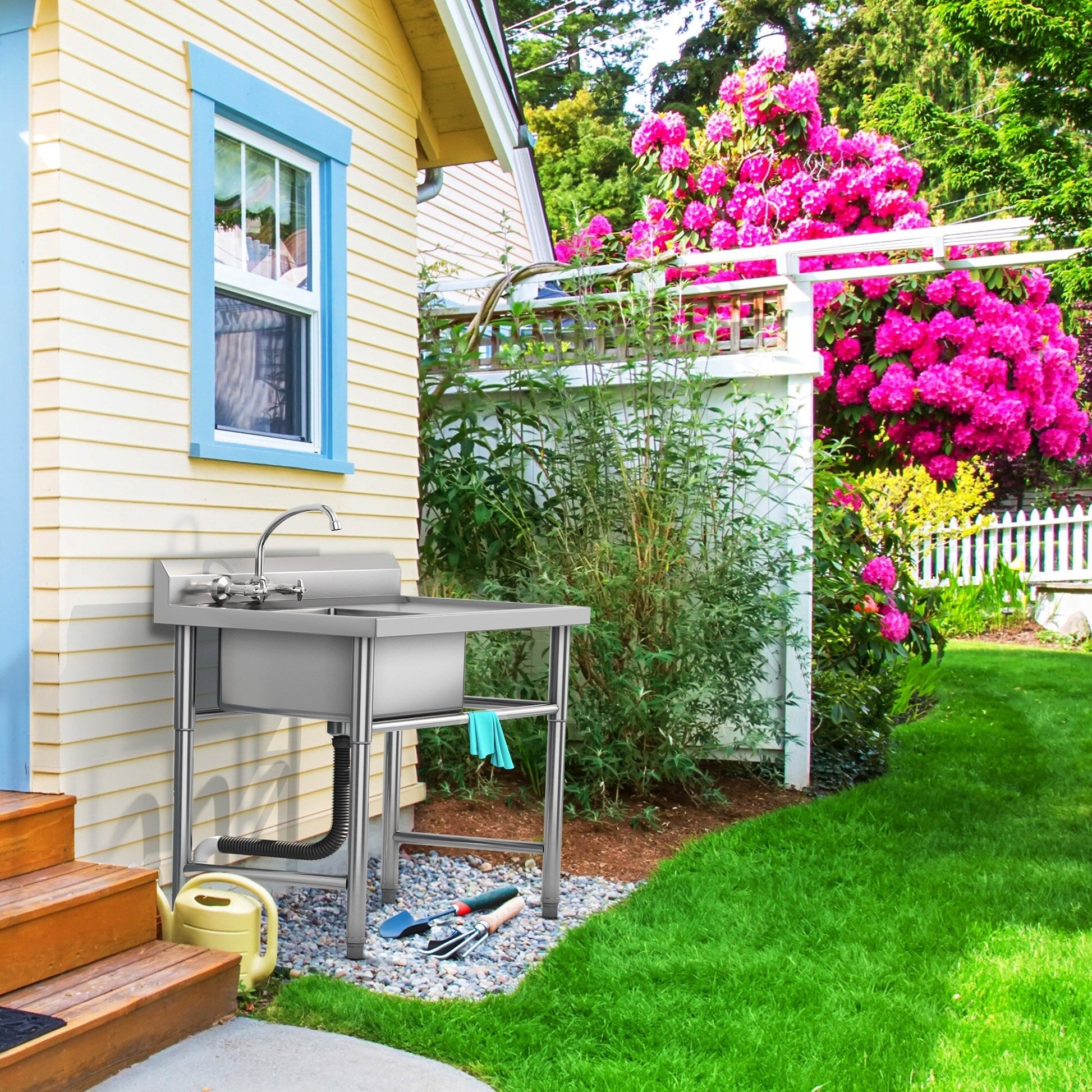 The freestanding utility sink is highly resistant to corrosion, oxidation, and deformation so it achieves long-lasting durability without rust or warping, no worry about leaks;     Additionally, its smooth surface makes it effortless to clean, saving you valuable time and effort in your life.  The overall size is 39'x18'x37' , Bowl size - 10.24' x 11.02' , 8.7' depth, making it ideal for cleaning dishes and even clothes, help maintain a bright, prevent clogging of the drain and clean operating environment;