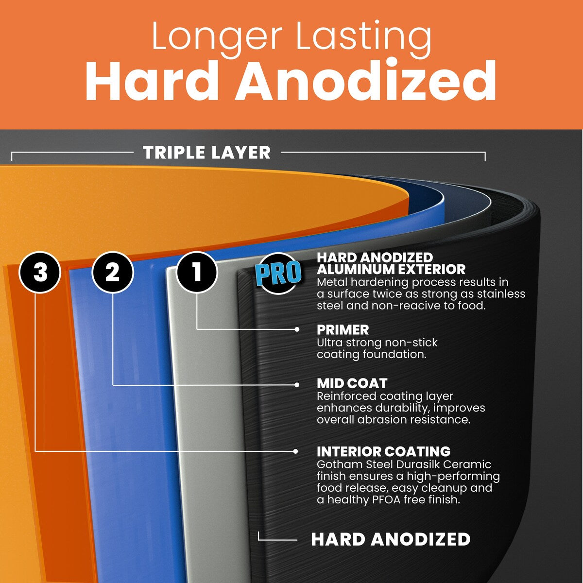 • Hard Anodized: Built to last, Gotham Steel Pro Premier cookware set is constructed from hard anodized aluminum, stronger than any stainless steel or regular aluminum, providing quick and even heat conduction through cookware, while resisting wear and tear, and ensuring years of outstanding usage from each piece of cookware.