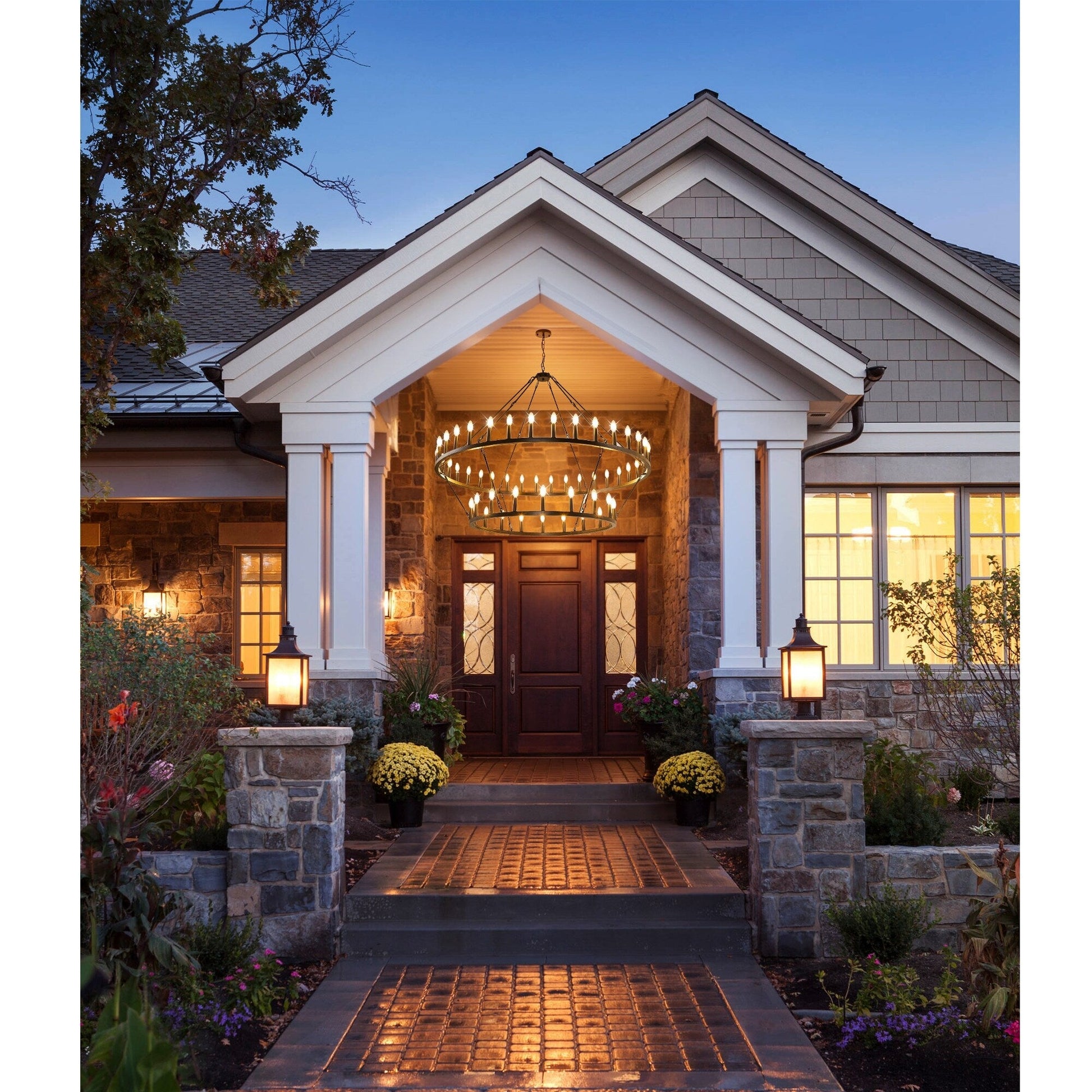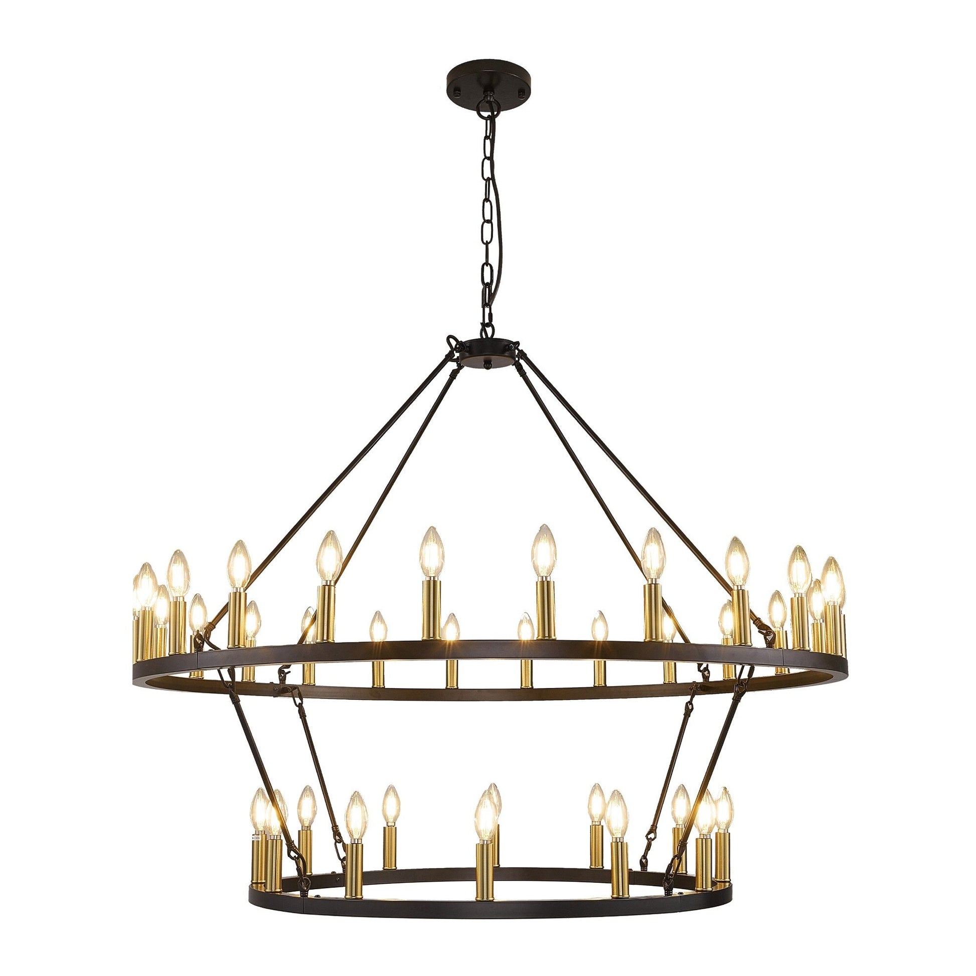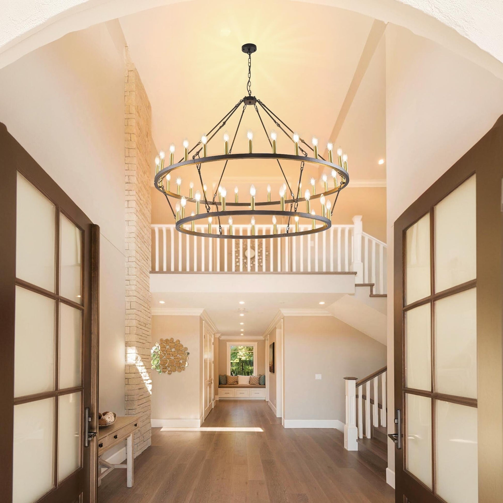 Add a touch of modern farmhouse style to your home with this Modern Farmhouse Chandelier 2 Tier Round Wagon Wheel Chandelier Large High Ceiling Light. This classic chandelier made of hight quality iron, powder-blasted for a matte finish, it is durable. 2 tier total 36 lights provides 360° light coverage, creates a cozy home atmosphere, this large chandelier is perfect for fully illuminating a large space like living room, dining room,  and large two story foyer/entryway.