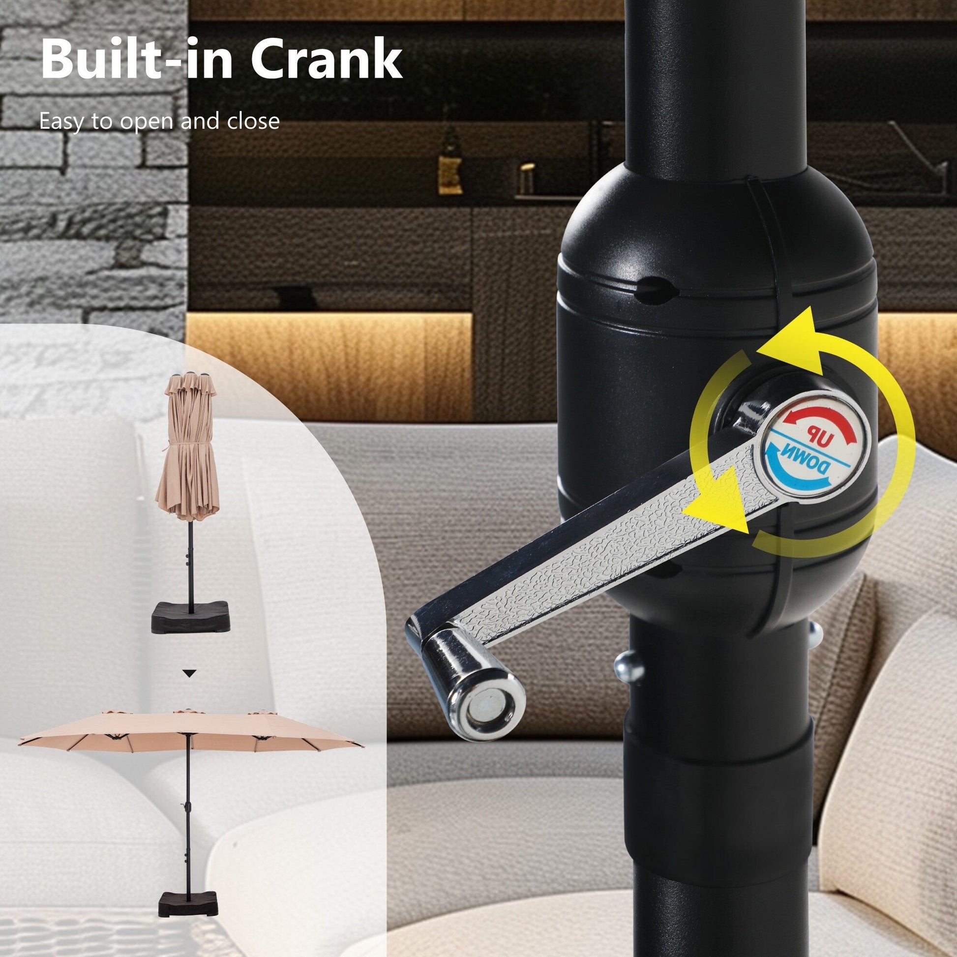 Transform your outdoor area with this stunning 15ft Double-Sided Patio Umbrella. Enjoy effortless opening and closing with the user-friendly crank lift that works in just 5 seconds. The beautiful canopy is made from 100% polyester, ensuring it is waterproof, fade-resistant, and UV-protected, providing you with breathable comfort in any weather. Plus, it comes with 36 LED lights (3 on each rib) powered by 3 solar panels, creating a cozy atmosphere with an automatic charging system for your convenience.