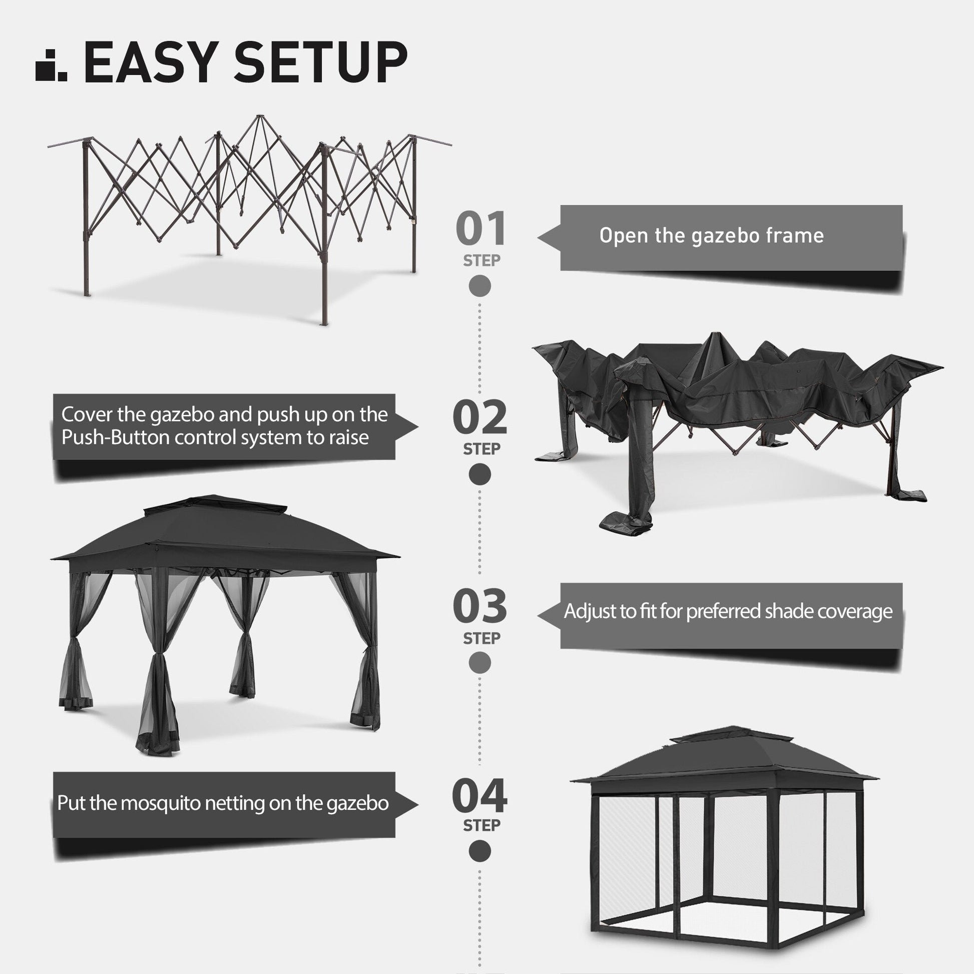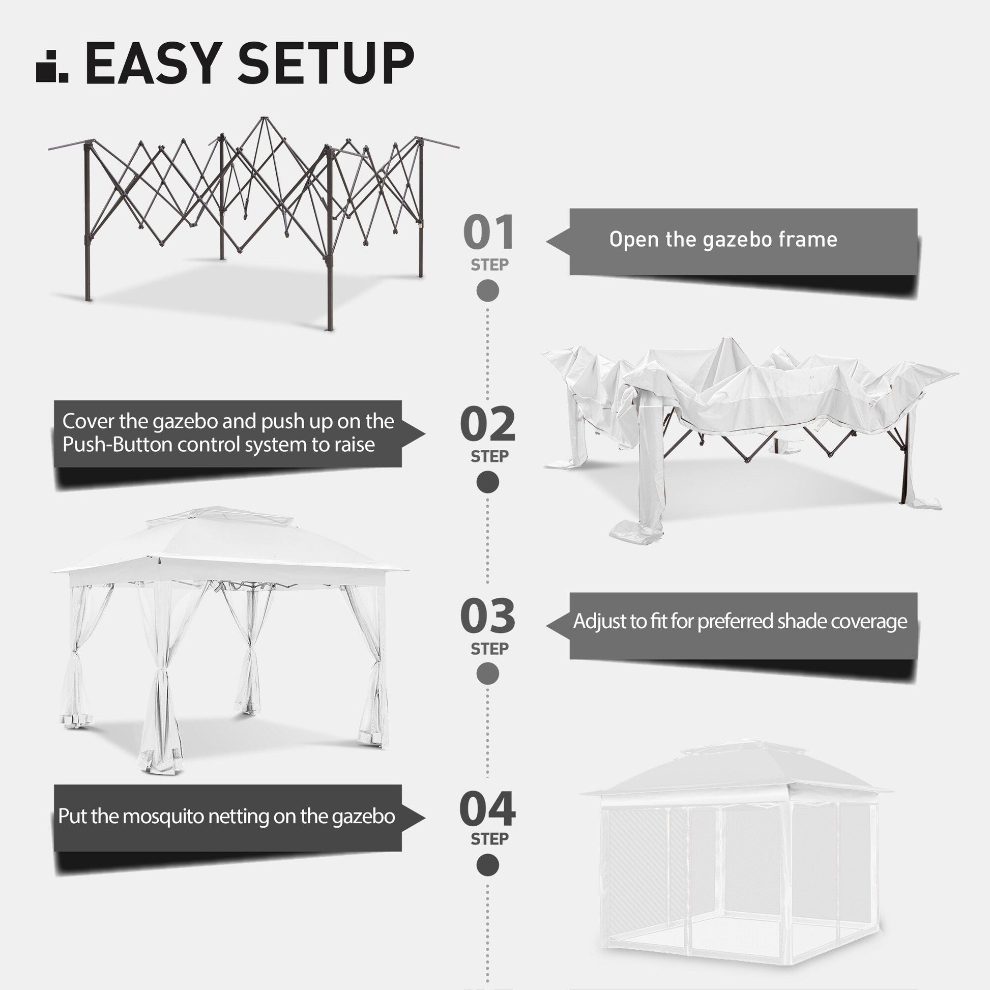 - EASY & EFFORTLESS SETUP - COZYWOR pop up gazebo is designed with patented 'one push to pop up' mechanism and sturdy powder-coated steel posts with adjustable height system, making the set-up process fast and hassle-free(refer to the manual and the process is less than 10 mins). At least 2 persons are suggested for assembly.