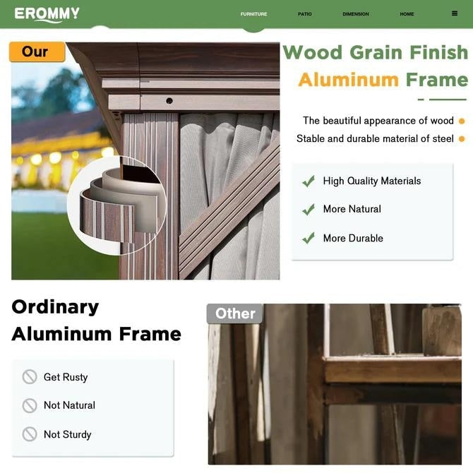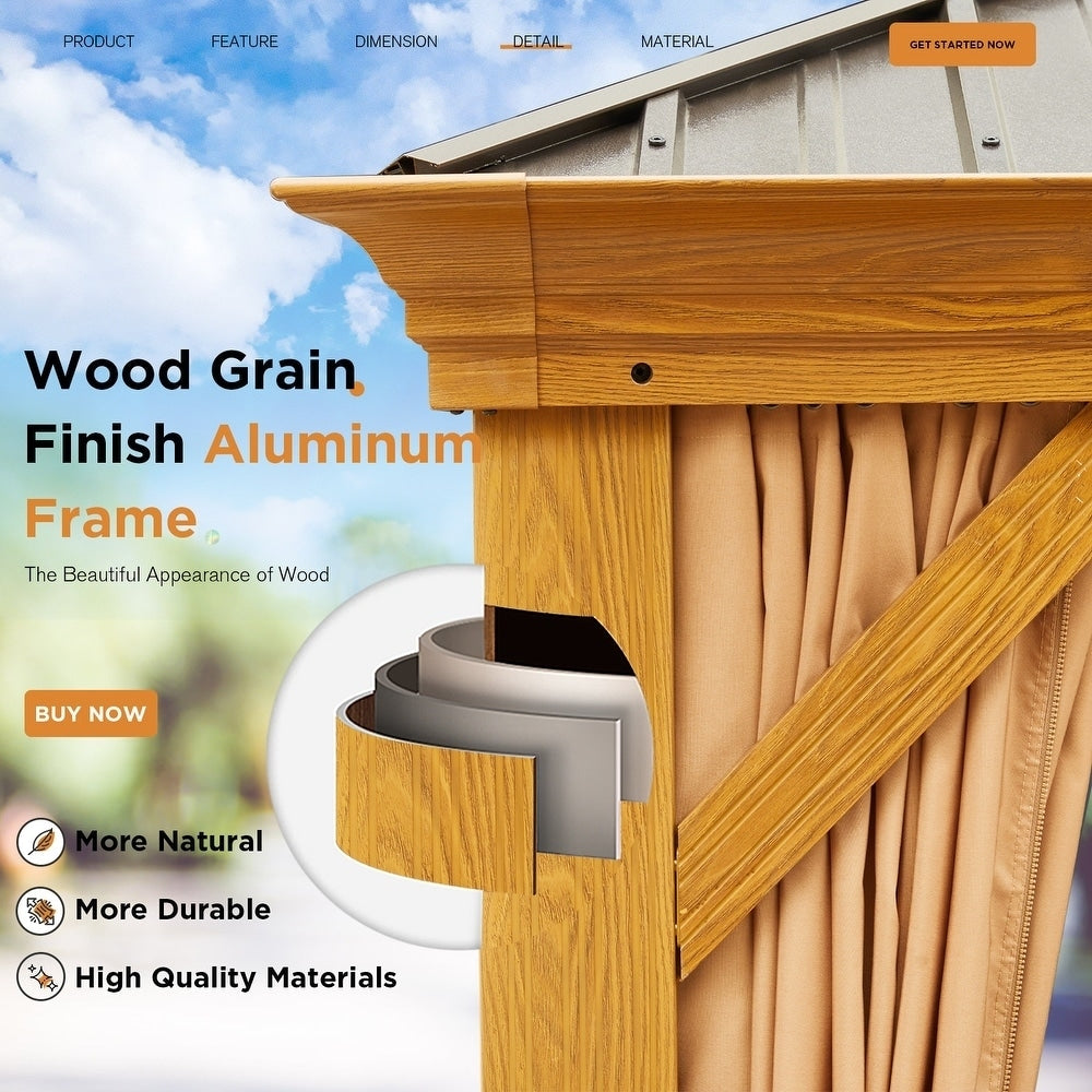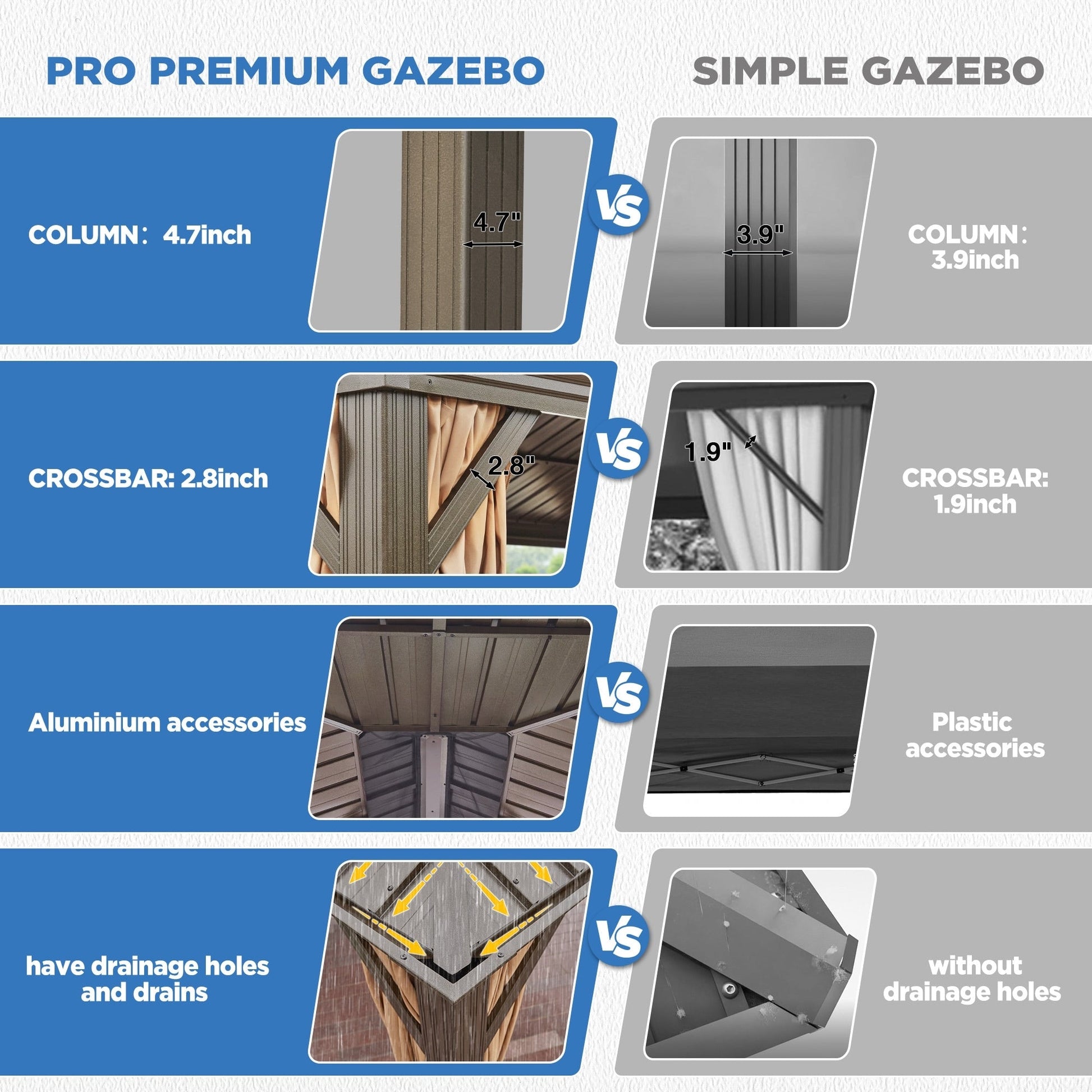 The frame of the rust-proof hardtop gazebo is made of aluminum with a strong powder coating that is very stable and sturdy. All materials are durable and also very easy to maintain. The patio gazebo will certainly become a comfortable space for you.