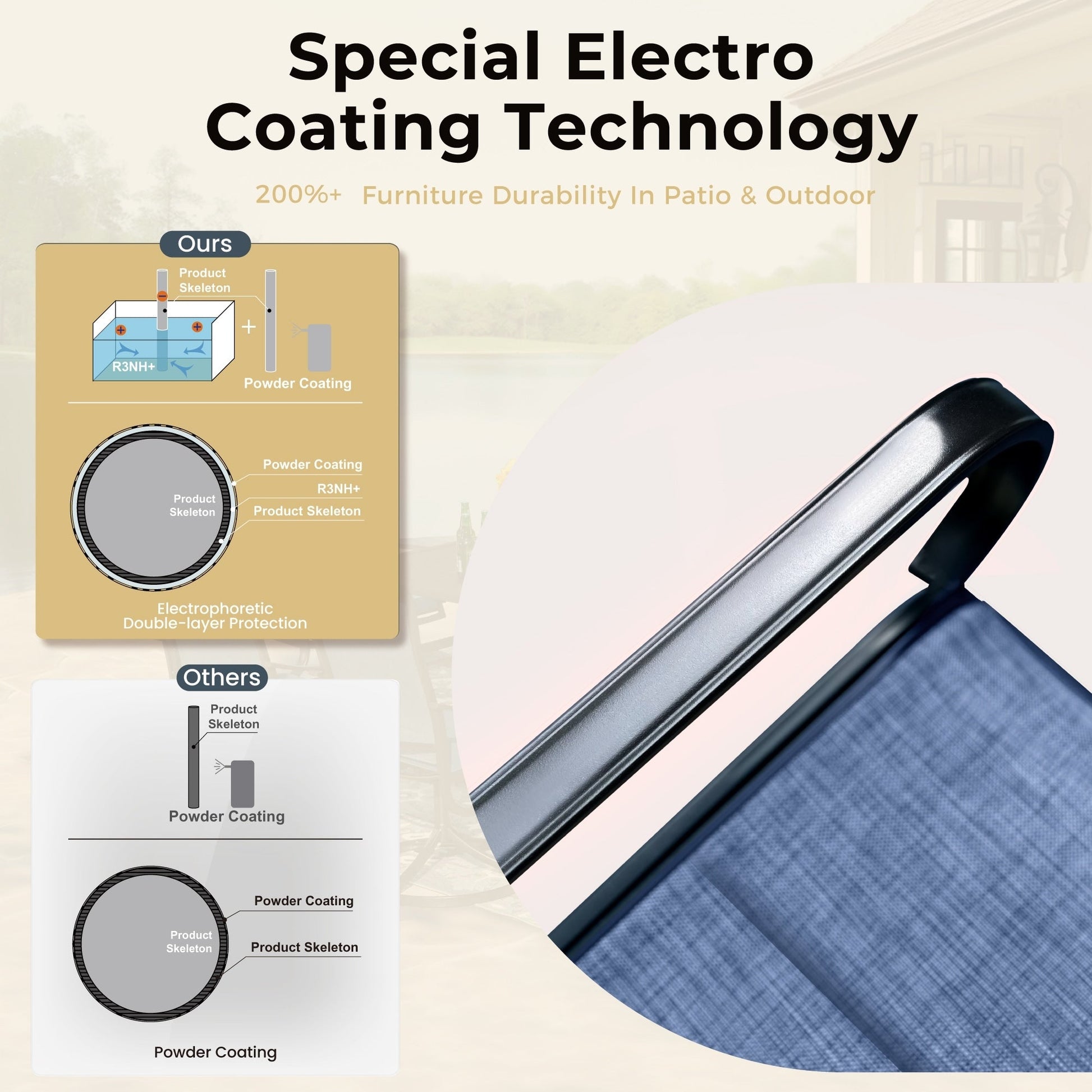 • Reinforced integral steel rectangular table with anti-rust coating and a 1.57' umbrella hole
