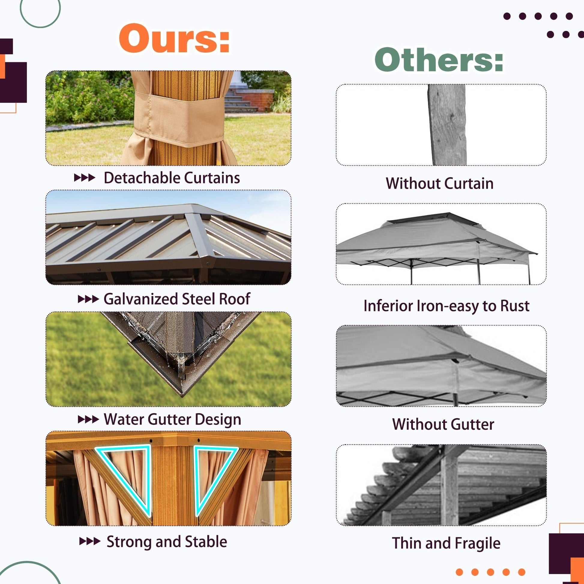 The frame of the rust-proof hardtop gazebo is made of aluminum with a strong powder coating that is very stable and sturdy. All materials are durable and also very easy to maintain. The patio gazebo will certainly become a comfortable space for you.