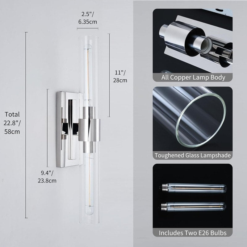 Vanity Light Fixtures Dimension: The modern wall sconce lighting height is 22.8'', the width is 2.4'', the glass lampshade size: is 2.4', canopy size is 4.7'. Light source: E26 base, voltage: 110-220V for worldwide. It is fully dimmable when used with a dimmer bulb and compatible dimmer switches.
