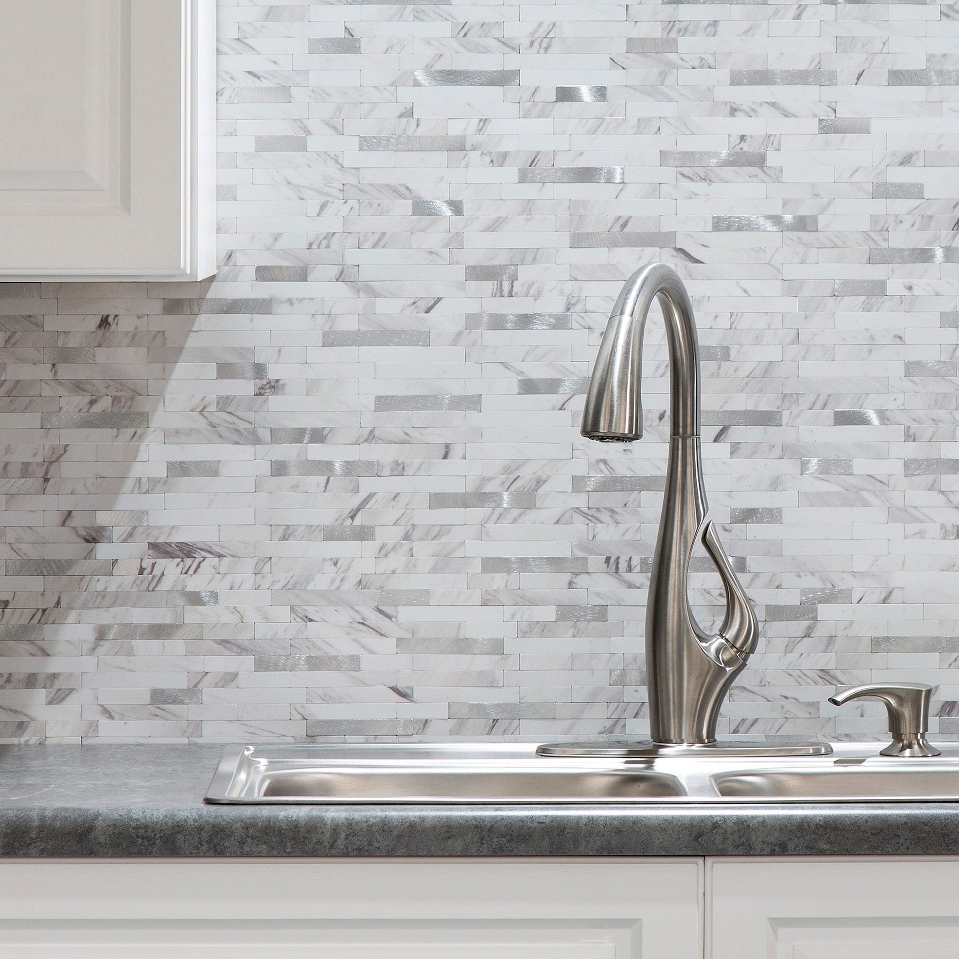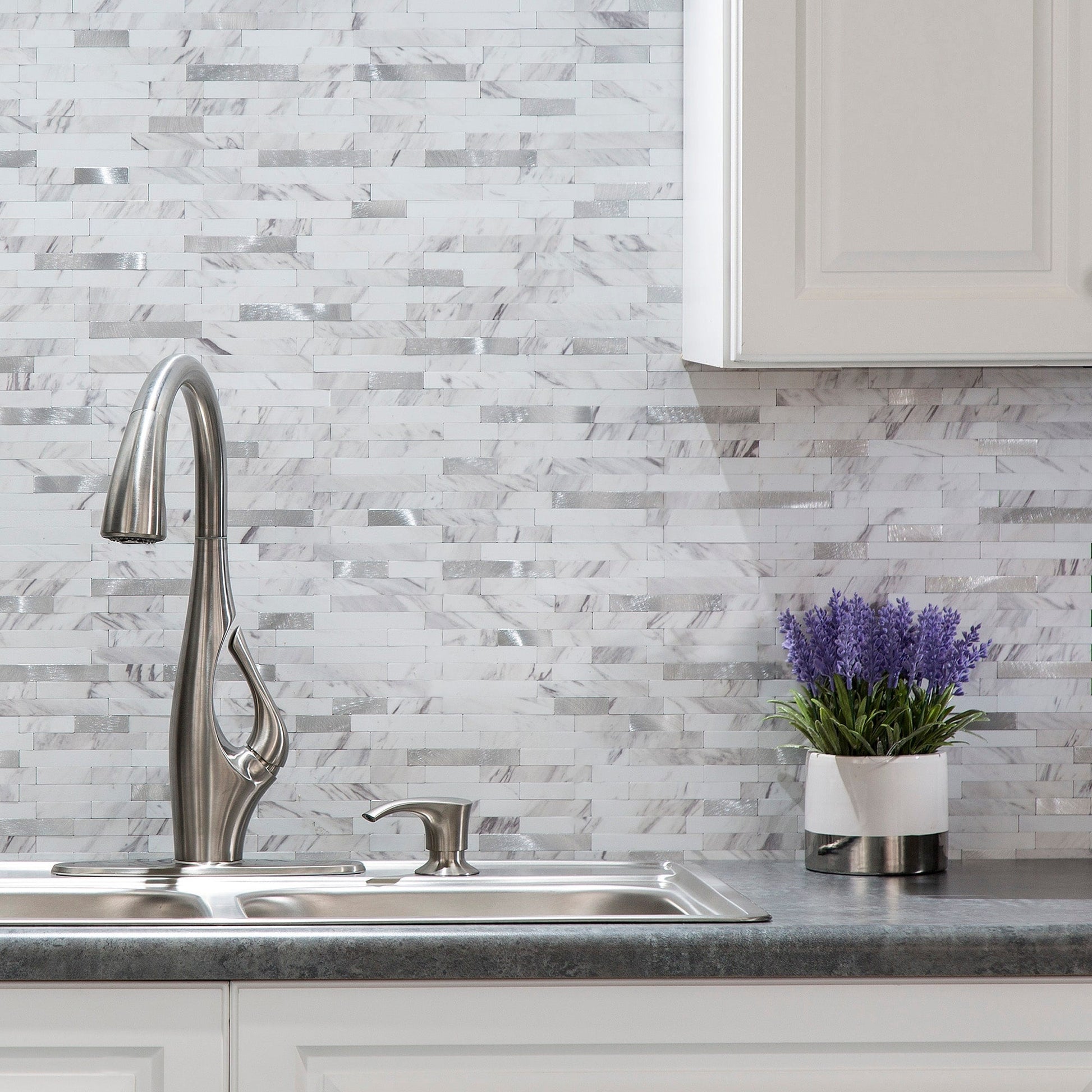 Update your kitchen or bathroom quickly and easily with Aspect Peel and Stick Collage. Aspect Collage tiles are a unique mix of durable composite finishes combined to create an elegant backsplash tile suitable for any room in your house. This eye-catching tile installs easily using Aspect's Peel & Stick technology - simply peel off the backing and stick! No mortar or grout is necessary making this the perfect DIY product to transform your room in as little as a few hours!