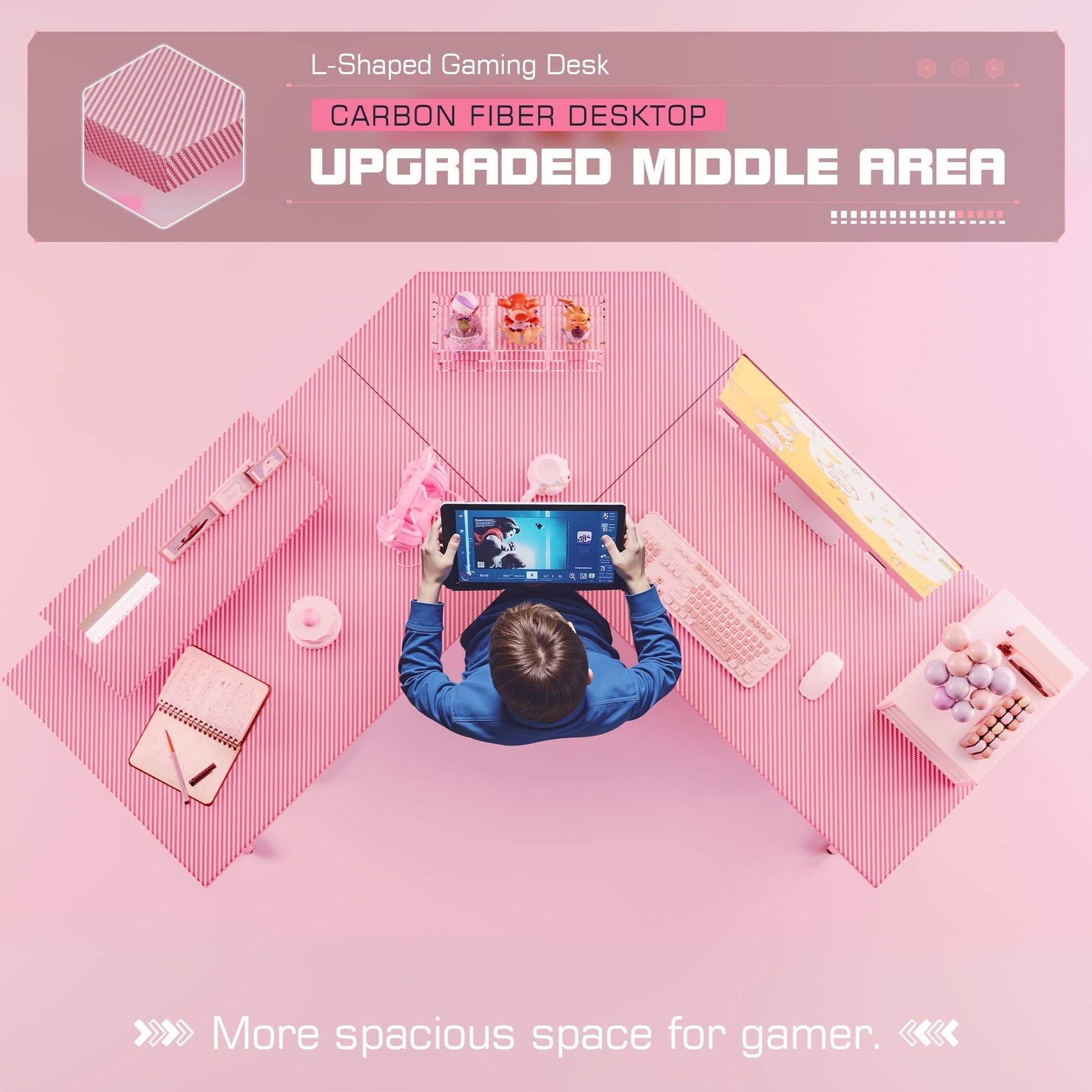 • Efficient Design: The L-shaped layout optimizes corner space, freeing up the central area of the room for a wider activity zone and providing ample storage options. The dual desktops facilitate seamless transitions during work or gaming sessions.