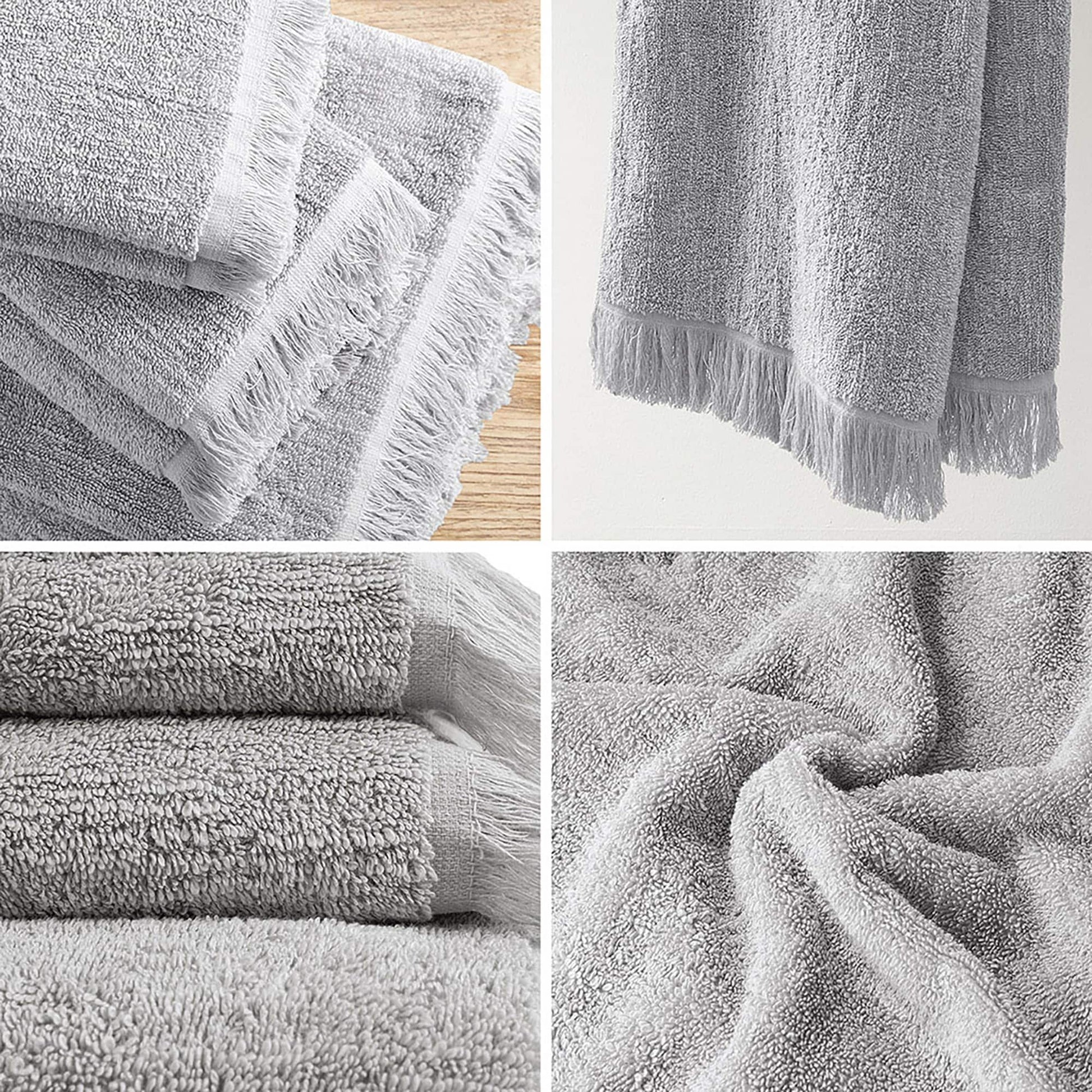 For a stylish and simply cozy update, the INK+IVY Atlas Cotton Dobby Slub 6 Piece Towel Set is the perfect soft and comfy addition to any bathroom. Made from 100-percent terry cotton, this towel set features an ink dyed slub pattern that creates beautiful texture and dimension; while a self-fringe hem detailing, provides a unique craftsmanship touch for an artisan and global inspired design. With a 630gsm rich quality weight, this cotton towel set offers a super soft, plush feel that is also highly absorbent to keep you warm and dry. Machine washable for easy care; this 6 Piece Set includes: 2 Bath Towels (30x54 inches), 2 Hand Towels (16x28 inches), and 2 Wash Towels (13x13 inches).