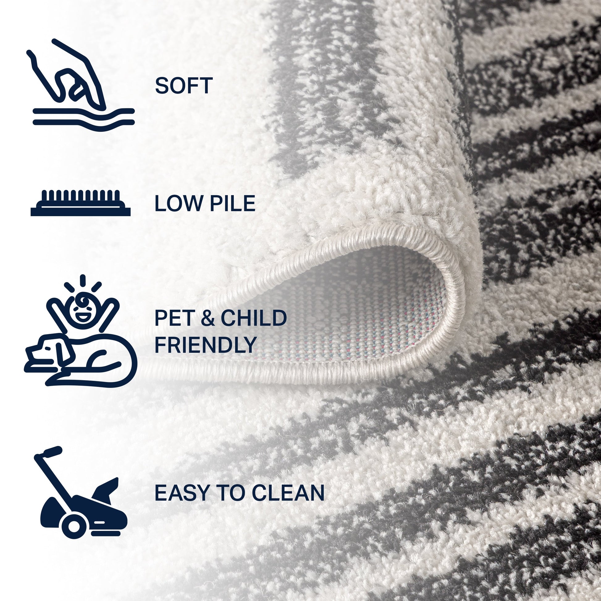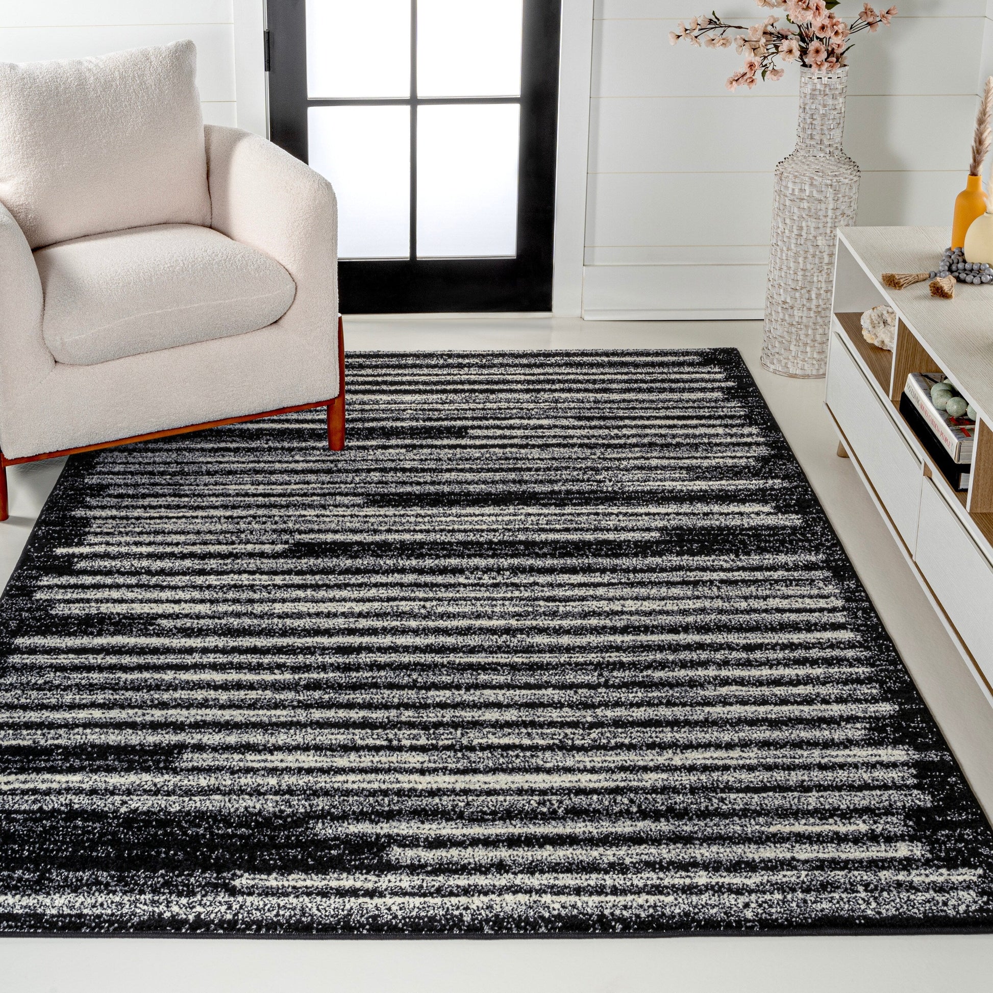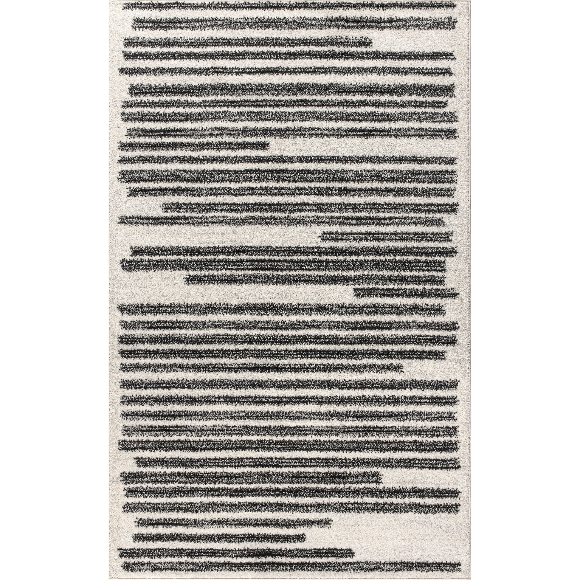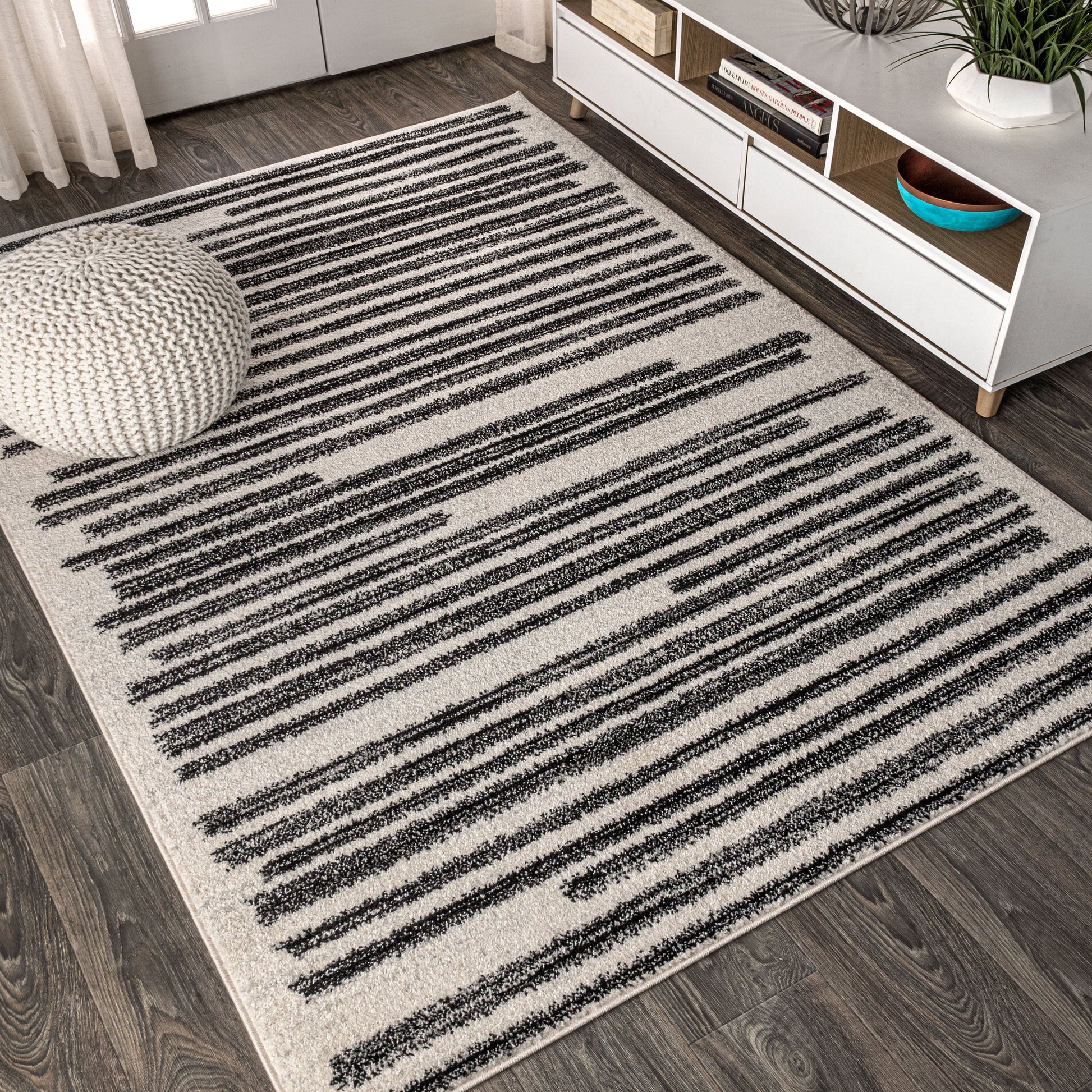Inspired by vintage Moroccan rugs, our modern striped rug is power-loomed with a short pile. The offset stripe and bar pattern is woven in black on an ivory background; the mingled threads recall traditional handwoven rugs. Add some mid-century style to your home with this easy-care rug.