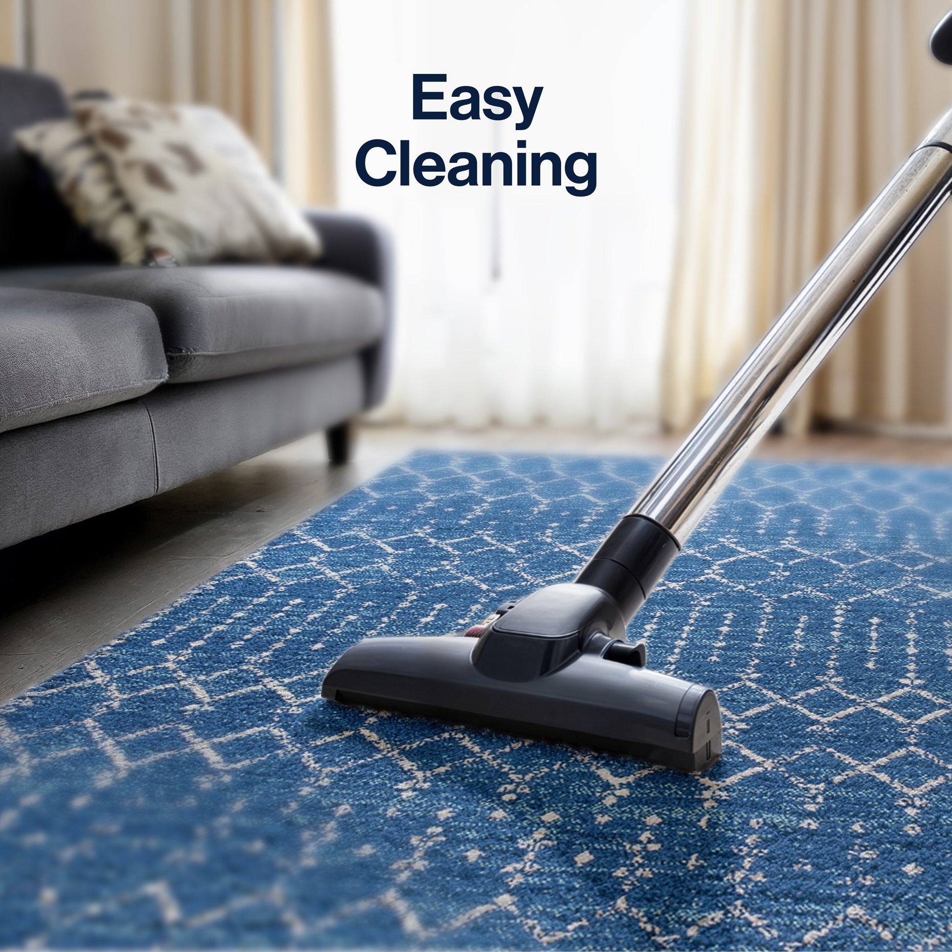 • Simple geometric design in shades of indigo and ivory suits any decor